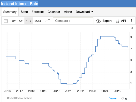 Central Bank of Iceland Key Interest Rate, 2016–2025. Source: TradingEconomics.com.