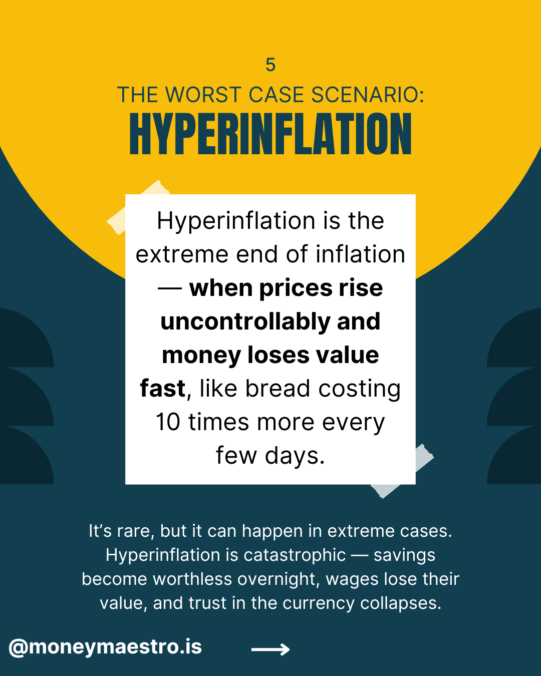Hyperinflation is the extreme end of inflation — when prices rise uncontrollably and money loses its value at an alarming rate. We’re talking about things like bread costing 10 times more every few days. It’s rare, but it happens in extreme cases — usually when a country’s economy is in turmoil.